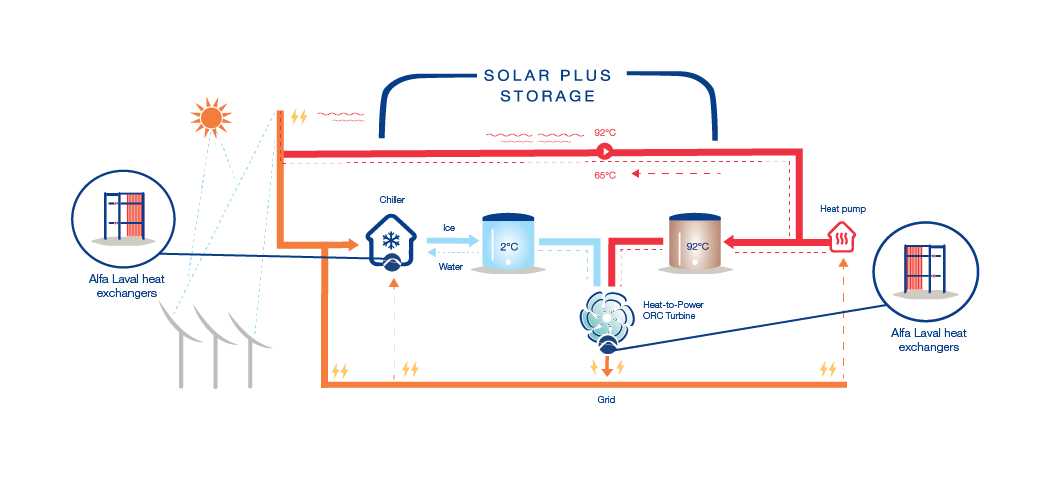 A két tározó - mindkettő nagyjából négy olimpiai úszómedence méretű - a szerves Rankine-ciklusú (ORC) rendszer hideg- és meleg tárolójaként működik. Ez az energiablokk szolgáltat igény szerint megújuló villamos energiát a tárolt energiából.